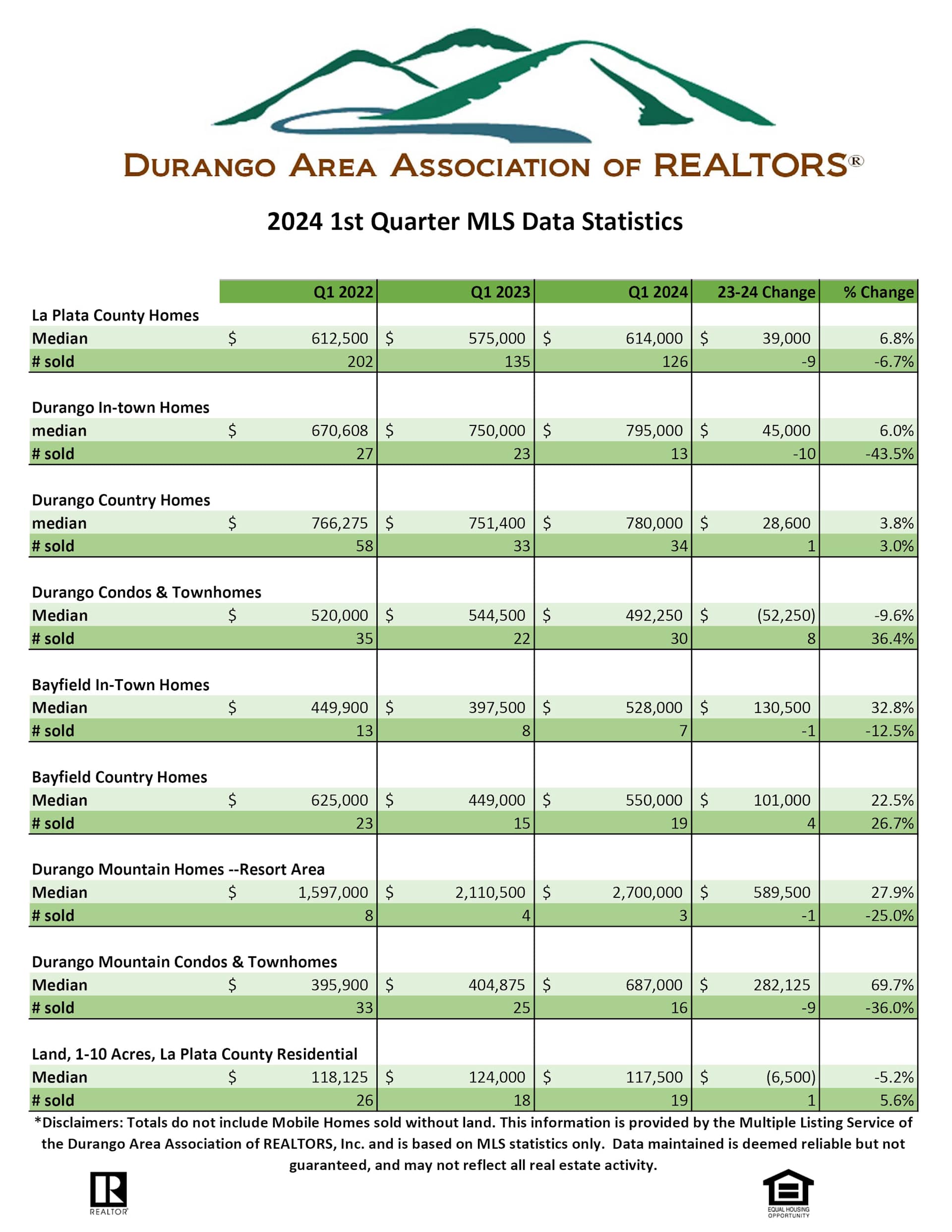 The first quarter is typically the slowest quarter of the year for La Plata County real estate and 2024 was no different. We continue to see increased average and median sales prices and fewer homes sold in most market segments.