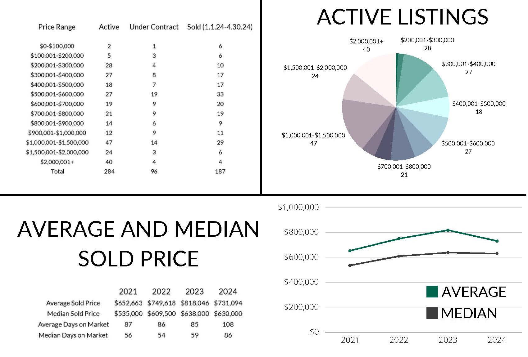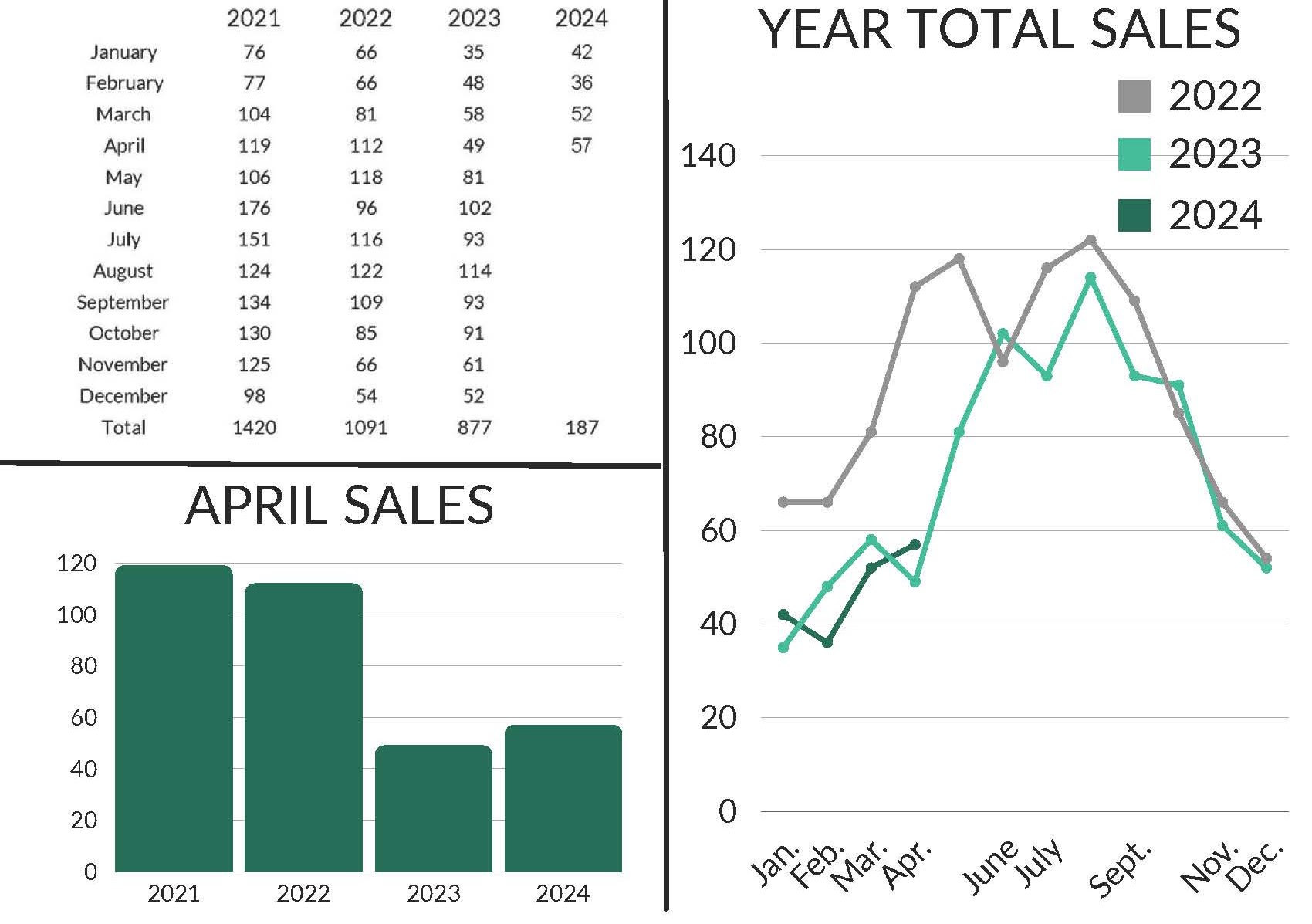 The first four months of 2024 were very similar to 2023 activity, with only 3 fewer sales. However, we are seeing more movement headed into the summer months as indicated by an increase of 36% in active listings and 60% in under contract listings since the beginning of the year.