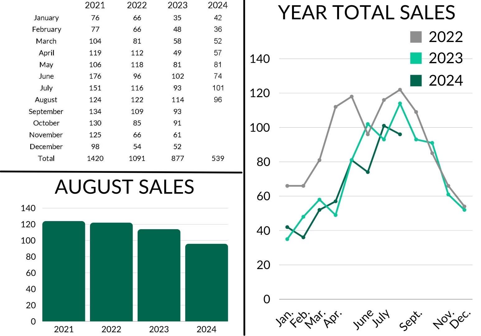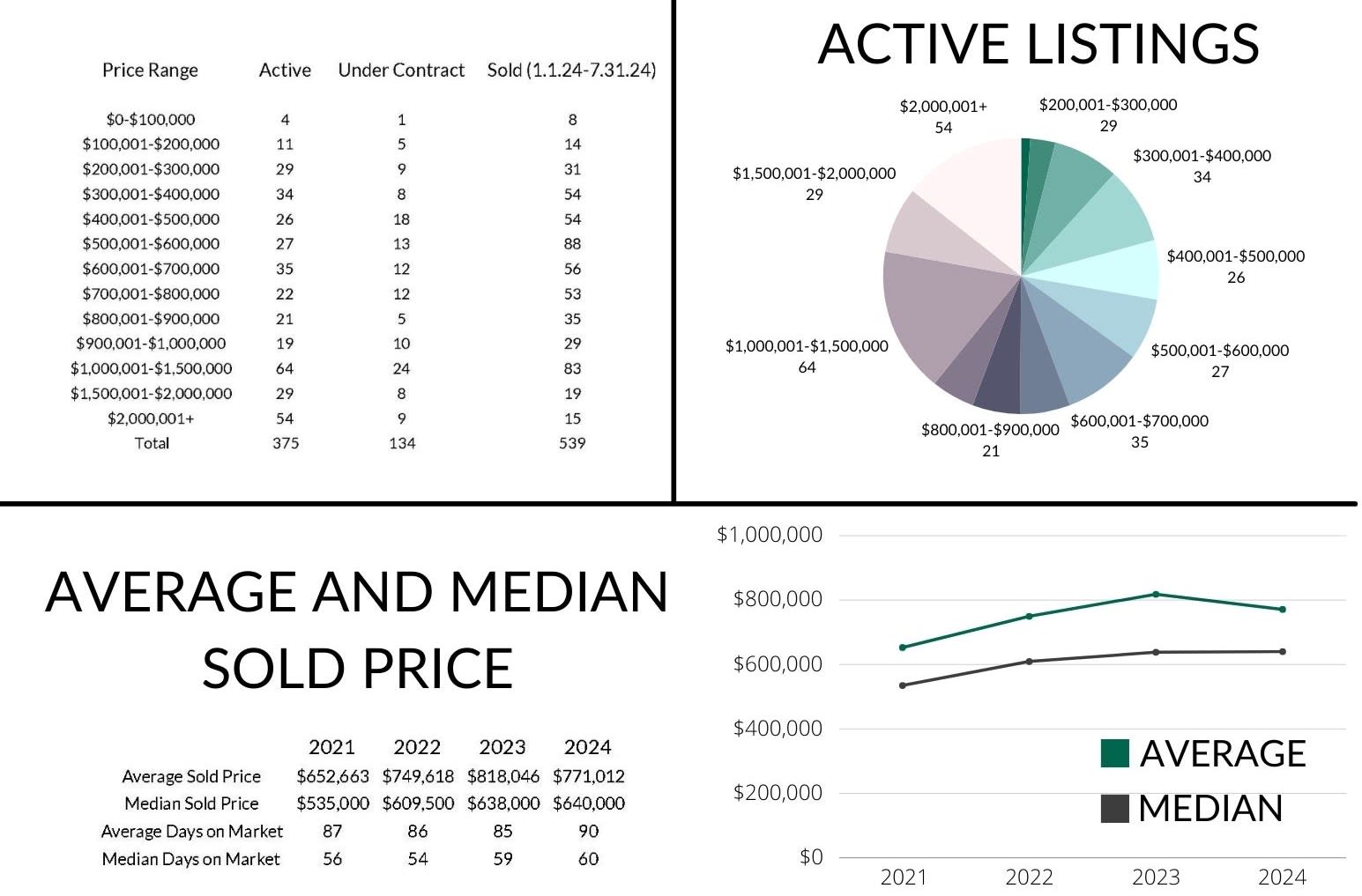 The average and median sold price increased by 2% since the end of January; the average is now $771,012 and the median is $640,000. The average days on market remain steady this summer at three months, while the median is two months. These numbers are slightly higher than August 2023. This indicates that the market remains strong with properties continuing to sell steadily, though not as fast as we’ve seen in the recent past. This is good news for both buyers and sellers because buyers have more time to make an informed decision, resulting in less terminated contracts for sellers.