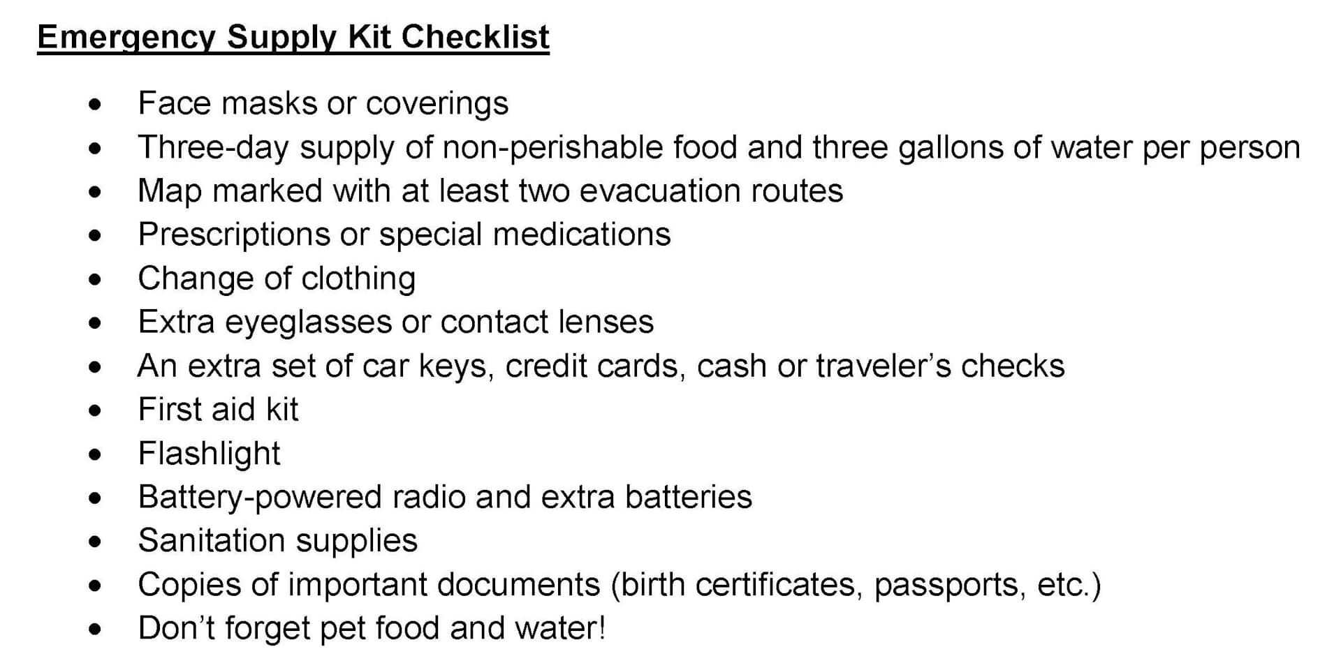 Gathering the essentials to create an emergency supply kit that is easily accessible and ready to go in the case of an emergency evacuation is important to have. The checklist compiled by the DFPD below includes items such as food, water, medications, first aid kit, and important documents. Of course, when there’s extra time to pack up the car, adding in additional supplies such as clothing, photos, electronics, etc. is good as well. If you have pets, don’t forget to bring the supplies needed for them as well! Each member of the household should have their own go bag with a map and plan for rendezvous.