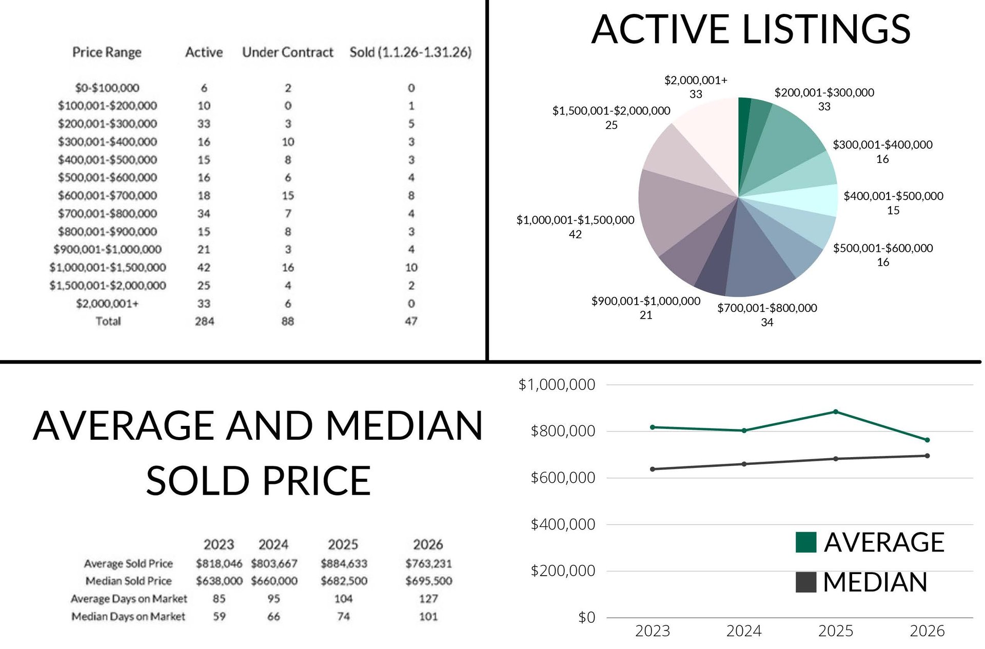 The average and median sales price reflect year-to-date totals, and this early in the year these numbers are easily influenced by notably high and low sales. In January, the median sales price settled at $695,500 which is about 2% more MoM and 10% YoY. As 2026 progresses, we will see both of these statistics begin to take more shape and more accurately represent our market.