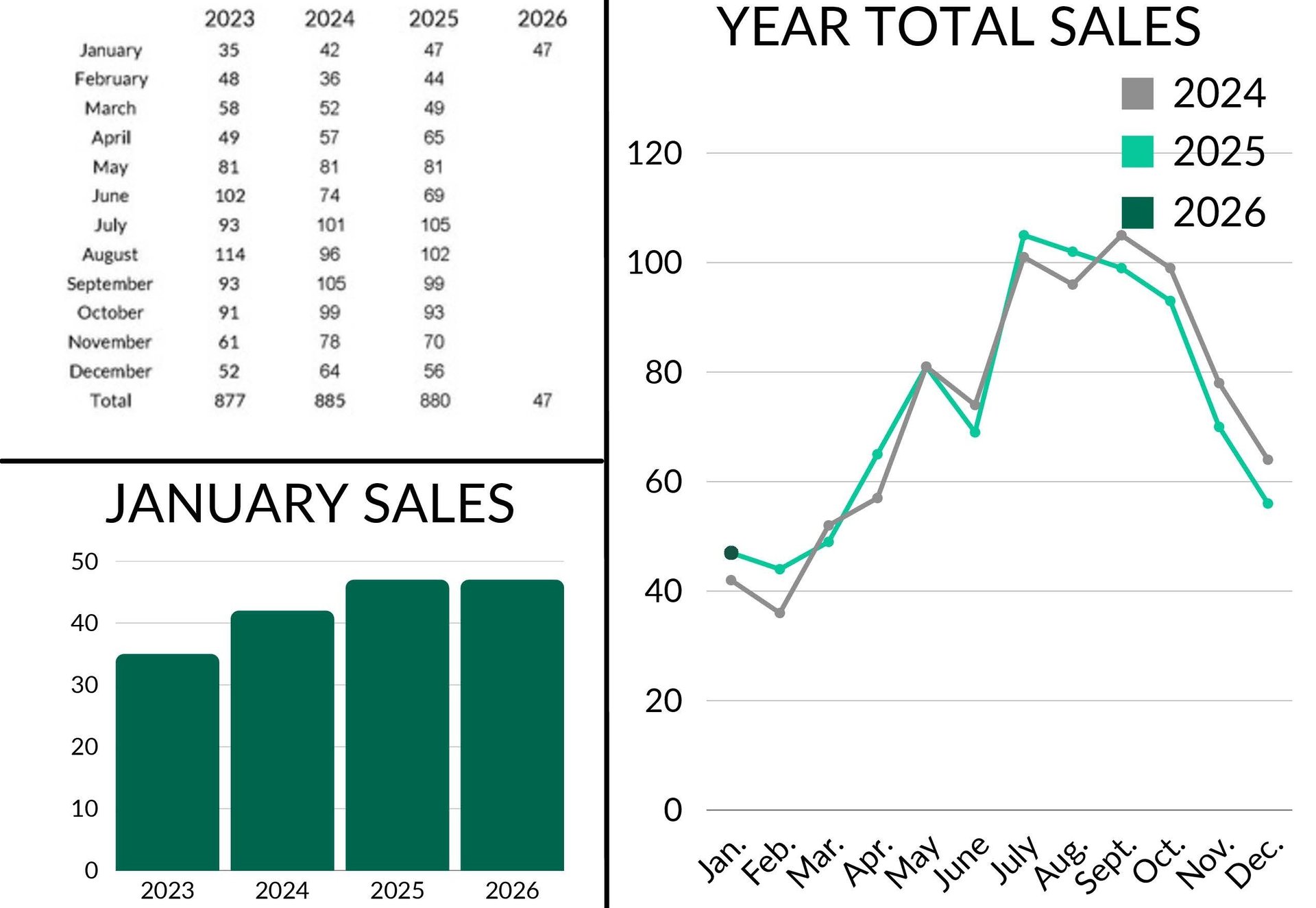 We expect to see a decrease in sales from December to January. December contracts are typically written in October and November when buyer activity is still strong, whereas contracts for January closings are often executed during the holiday season, when buyer activity slows down significantly . It is, however, unique to have the exact same number of sales two years in a row. This data aligns with our 2026 prediction that this year will follow a similar pattern as 2025, with prices continuing to recalibrate and much less fluctuation.