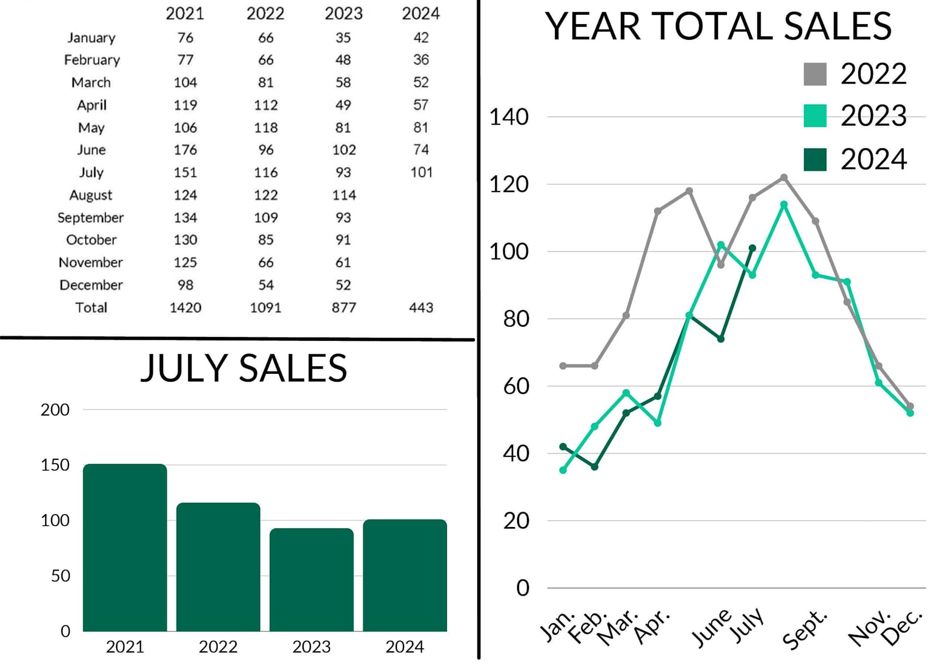 Starting Q3 of 2024, July saw a 36.49% increase in sales compared to the previous months, bringing the year-to-date total to 443 sales - just 5.19% less than this time last year. July 2024 experienced a slight increase in sales compared to July 2023. Of these 443 sales, a significant portion, 252 homes, fell within the $300,001 - $800,000 range. This is offset by an additional 65 sales between $1,000,001 - $1,500,000 resulting in a median price of $638,000 and an average of $761,765. Although this average is about $56,000 lower than 2023, the median is exactly where 2023 ended. The 93 average and 61 median days on market are slightly longer than last year, however these numbers remain lower than pre-Covid years.