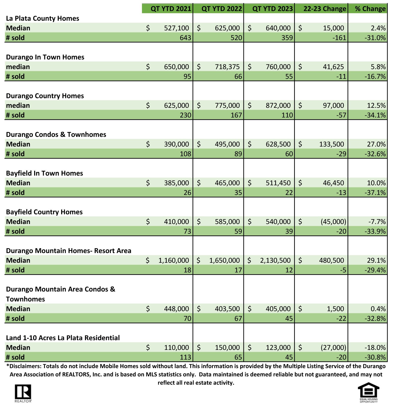 The La Plata County real estate market saw increases in median and average sales prices across nearly all market segments in the 2nd quarter. This is particularly good news for homeowners in Bayfield; prices rebounded in Q2 for both in town and rural properties from the dips in Q1. While the information below shows that Bayfield rural home prices have decreased, this is year to date information, and increases in both median (6%) and average (12%) during 2nd quarter are bringing these numbers back in to balance. This same trend occurred for La Plata County rural homes as well, with a 17% median and 12% average sales price increase. In town Durango homes have settled back in to a 5% increase which is more customary than the large jumps in the last 3 years.