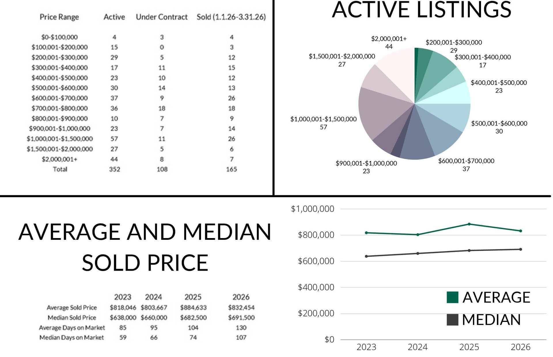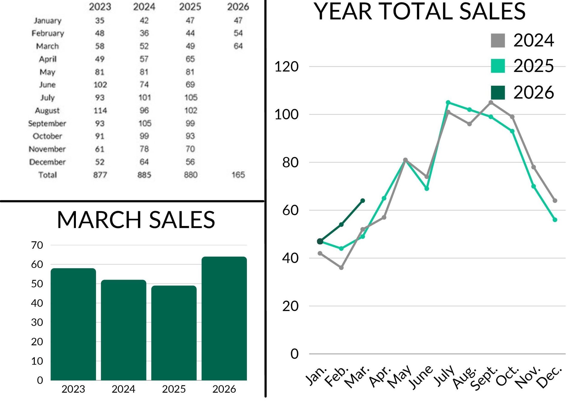 Inventory has continued to rebuild both MoM and YoY, now nearly 30% higher than March 2025. This is one of the most important trends and is healthy for our market, though it can be frustrating for sellers. With over 10% growth MoM, we hope this trend continues into summer, giving both buyers and sellers the options needed to move. We like to see the increased number of pending sales as we close out Q1, which also tracks closely with the rise in available inventory.