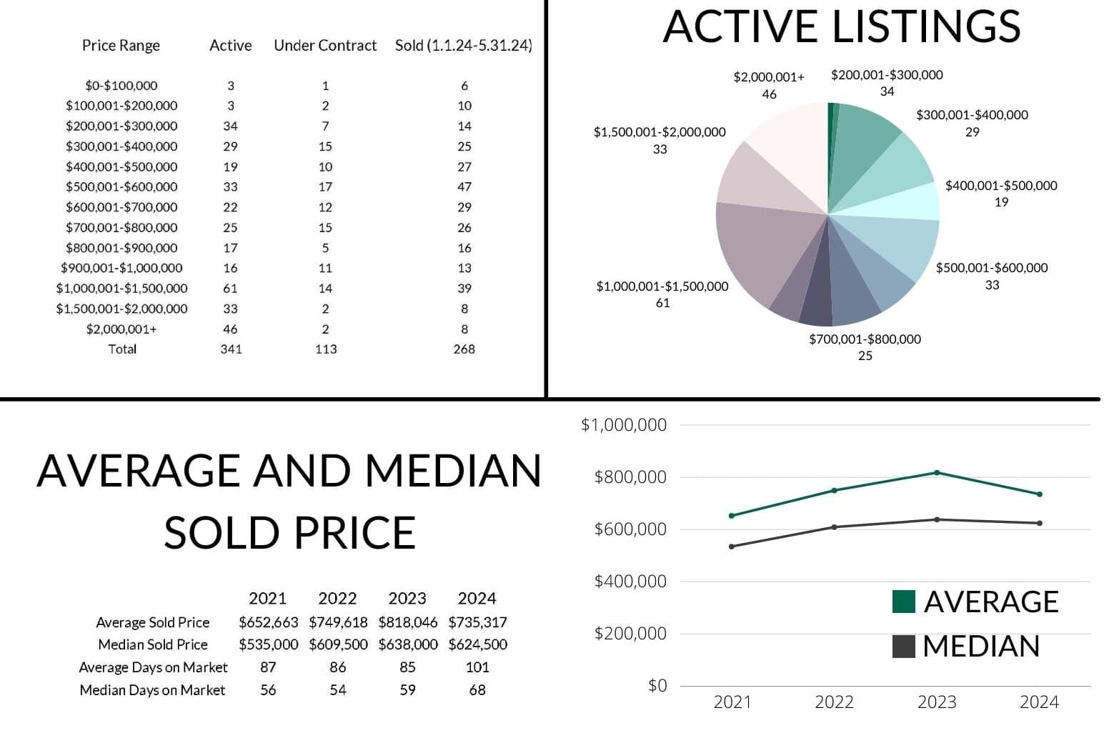 One of the most important changes in the May statistics is the 43% increase in active listings year over year. This substantial boost helps meet the ever growing demand for property in La Plata County. As of May 31, 2024, there were 341 active listings. While 140 were listed over $1,000,001, there were another 162 in between $200,001 - $800,000, which helps anchor average and median prices. With summer and fall typically the busiest buying and selling season, we anticipate these inventory and sales numbers continuing to rise in the third quarter.