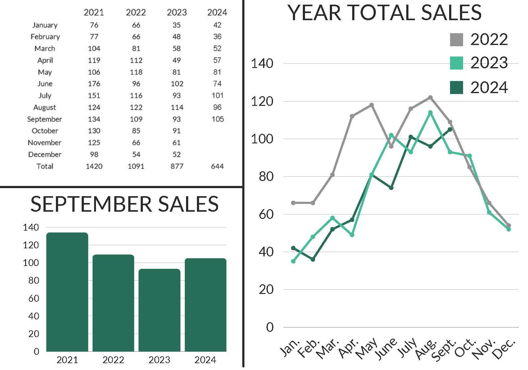 In September 2024, there were 105 residential sales, and 644 sales total in 2024. This marks our busiest month of the year. Of the 644 sales, there are two dominant price categories: $500,001 - $600,000 with 103 sales and $1,000,001 - $1,500,000 with 102. The median price has increased by 2%, while the average, now at $784,147 is about 4% lower than the 2023 average. We watch the median number more closely because it does not subject large fluctuations like the average. Days on market remain close to their summer numbers.